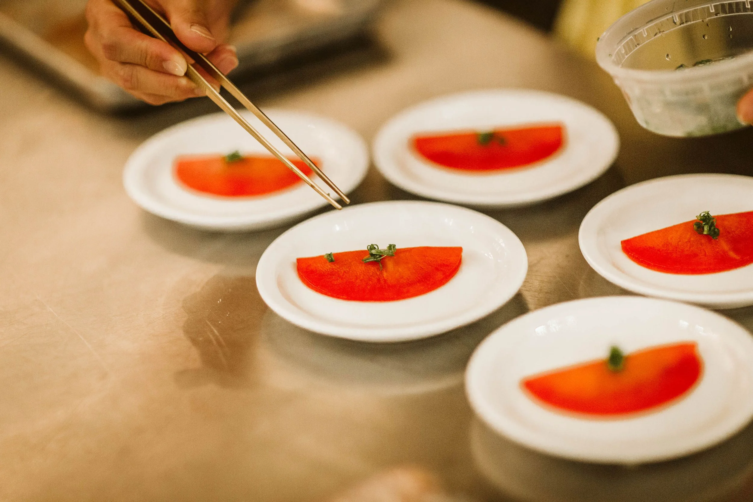 Chef preparing plates with thin red slices of fruit or vegetable using tweezers, garnished with small green herbs.