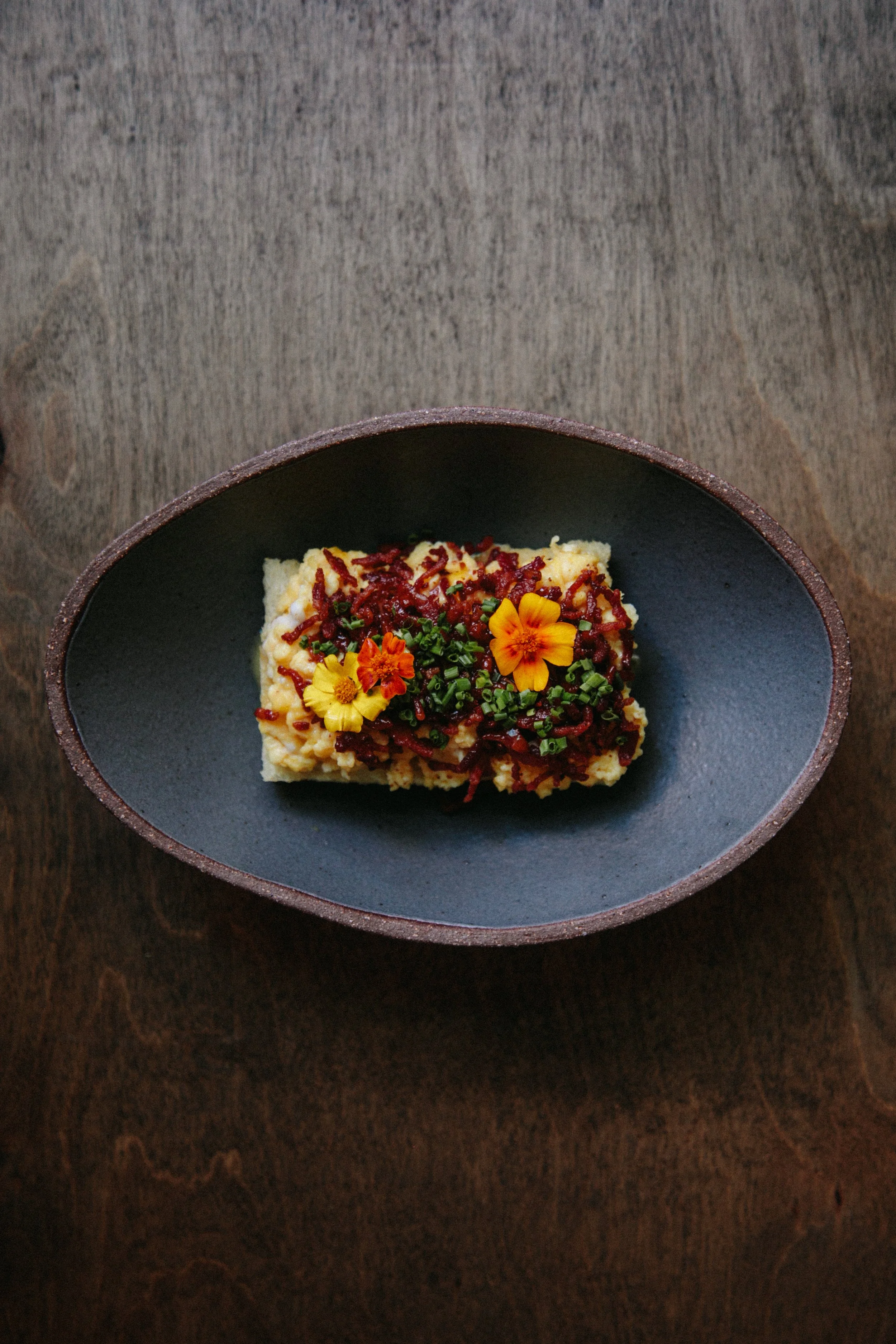 A rectangular dish with mashed potatoes, crispy bacon bits, chives, and edible flowers in a dark oval bowl on a wooden surface.